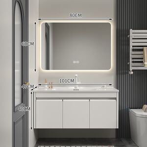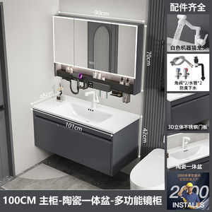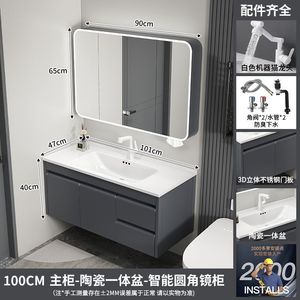 智能豪华全封圆角镜柜-灰色 包安装-102公分陶瓷盆-双抽双门