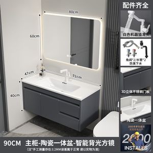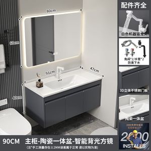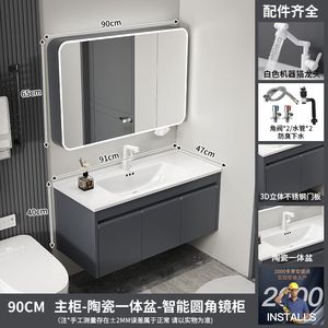 智能豪华全封圆角镜柜-灰色 包安装-91公分陶瓷盆-双抽双门