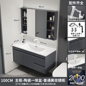 豪华美妆无灯镜柜-灰色 包安装-102公分陶瓷盆-双抽双门