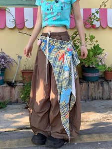 美式复古格子屁帘绑带叠穿伞兵裤男女夏季新褶皱弯刀阔腿裤子潮