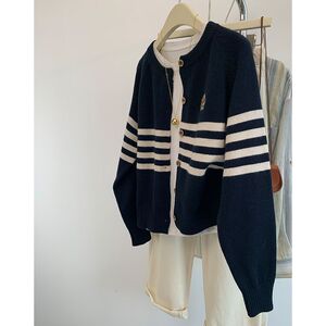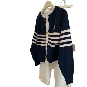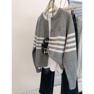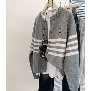 韩系学院风条纹长袖毛衣开衫2025春季新款小熊刺绣宽松针织上衣女