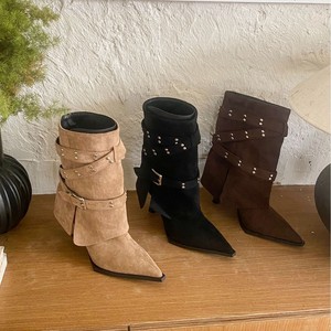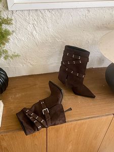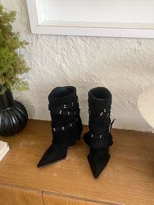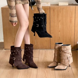 铆钉绒面高筒裤管靴女2025年新款小众设计感尖头细高跟中筒骑士靴