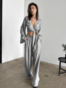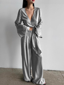 高级感灰色苎麻V领上衣长裤两件套2025秋季欧美街头时尚棉麻套装