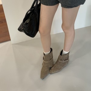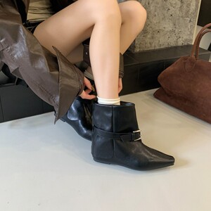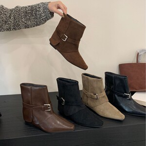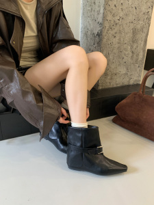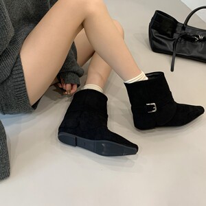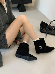 2025年新款秋冬方头皮带扣内增高短靴女时装靴绒面法式中跟短筒靴