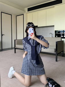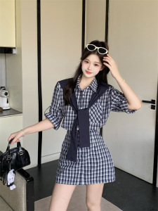 韩版气质撞色拼接披肩格子短袖衬衫连衣裙女夏小个子收腰显瘦短裙