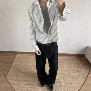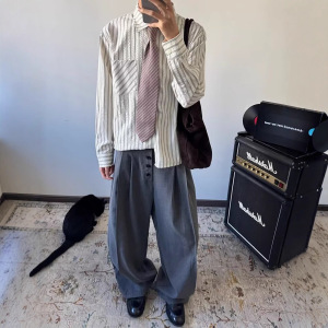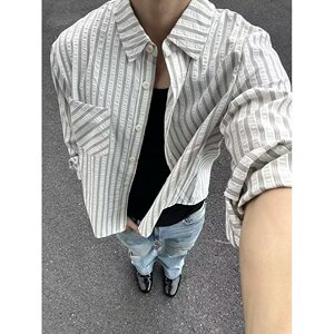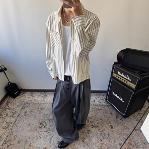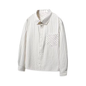 条纹泡泡纱衬衫2025秋季新款休闲正肩长袖衬衣复古条纹上衣男潮牌
