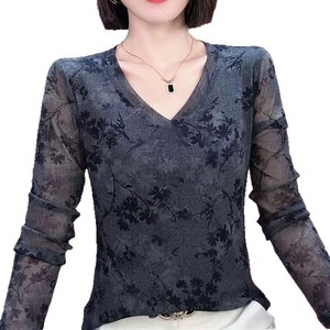一件代发2025秋季新款时尚洋气百搭通勤气质V领弹力网纱长袖T恤潮