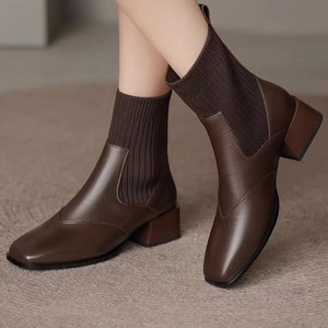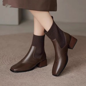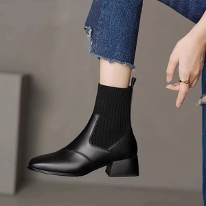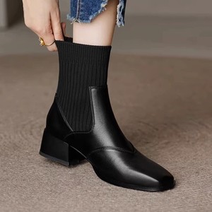 粗跟短靴女2025新款秋冬加绒单靴法式复古方头针织弹力瘦瘦靴
