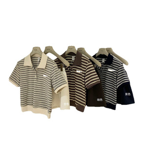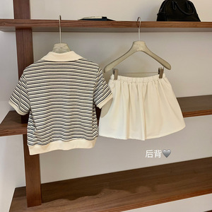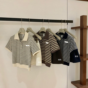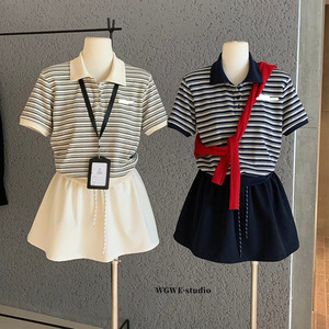 WGWE6724法式减龄polo短袖条纹T恤新款甜美气质撞色百搭上衣套装