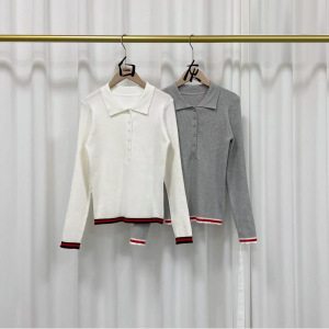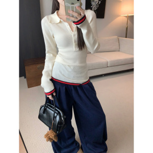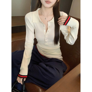 别致条纹撞色POLO领长袖针织衫女秋季2025新款修身设计感小众上衣