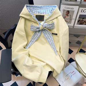 洋气独别致绑带蝴蝶结卫衣女初秋冬穿搭感撞色格子连帽上衣