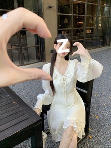 温柔风V领系带长袖连衣裙女木耳边春秋新款法式气质显瘦边小白裙