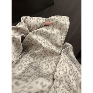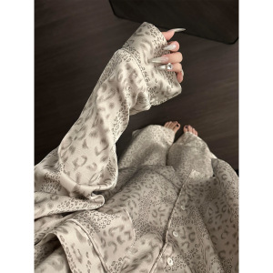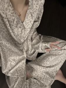 韩系豹纹设计冰丝睡衣女早秋新款大码锻面长袖长裤家居服套装ins