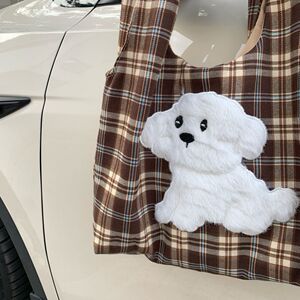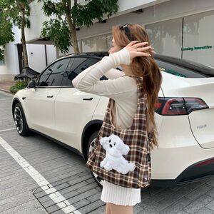秋冬时尚毛绒卡通小熊格子背心包学生大容量帆布袋少女休闲单肩包