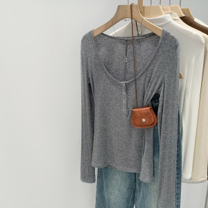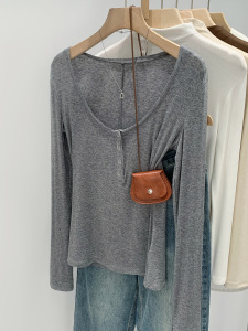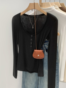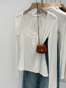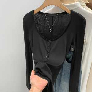 莱赛尔天丝羊毛半排扣长袖T恤女2025早秋新款修身内搭打底衫上衣