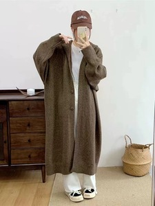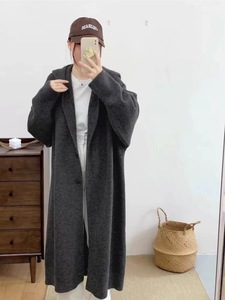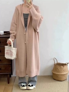 2025秋冬新款连帽宽松慵懒风长款针织大衣纯色简约法式开衫外套女