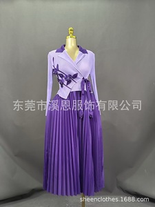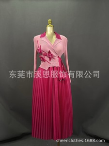 新款Miayki时尚立体玫瑰钉花西装领重工礼服百褶连衣裙女装大码跨