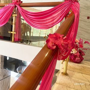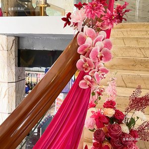结婚楼梯装饰栏杆扶手玫红色花婚房布置酒店阳台花艺绸缎布幔