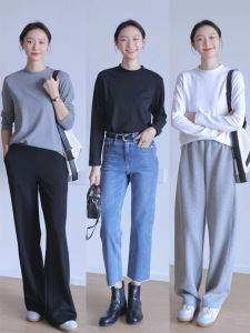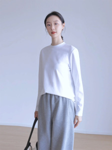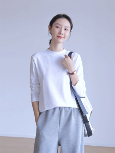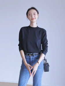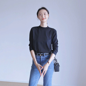 简约休闲纯棉小立领t恤女长袖通勤宽松显瘦半高中领打底衫上衣