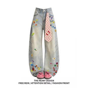 刺绣花水洗垂感牛仔裤女春新款高腰宽松显瘦百搭直筒阔腿拖地裤潮