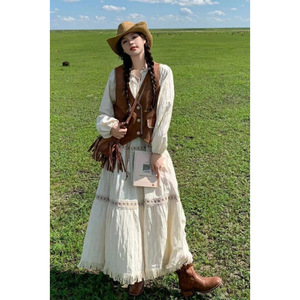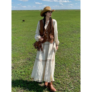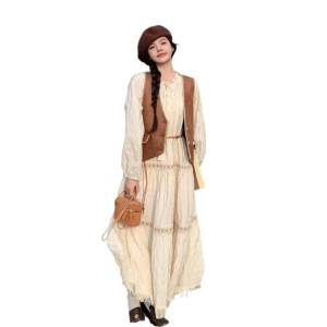 米白色连衣裙套装春秋女新款度假风长裙复古美拉德马甲两件套
