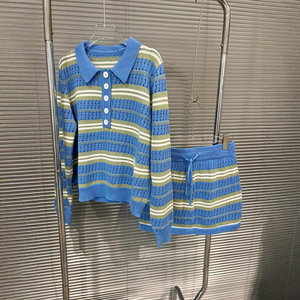 2025早秋新款洋气时尚条纹针织衫+松紧腰短裙套装女