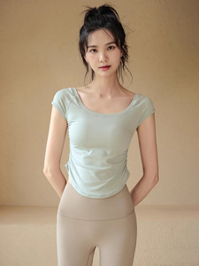 锦纶裸感短袖瑜伽健身速干套装晨跑透气修身显瘦大码运动上衣洋气