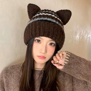 美式甜酷加厚条纹针织帽秋冬保暖猪耳朵毛线帽休闲百搭防风套头帽