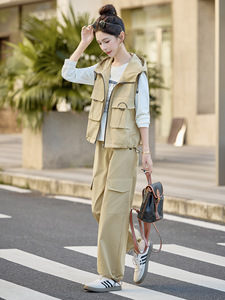 时尚休闲套装2025秋季新款女装连帽马甲针织衫阔腿裤三件套HF8901