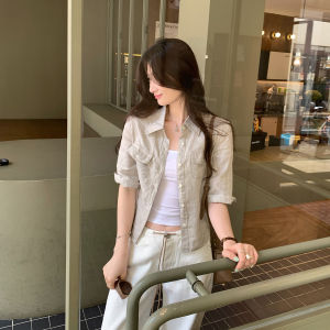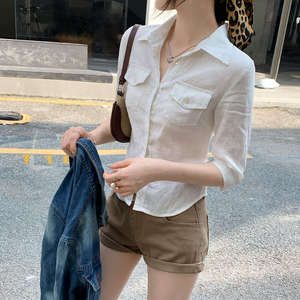 法式高级感系带收腰亚麻中袖衬衫女夏2025新款洋气独特别致小上衣