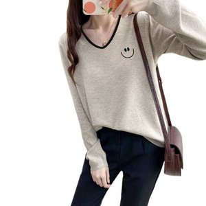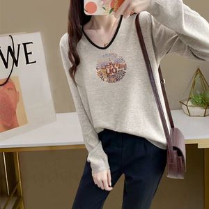 设计感V领撞色长袖T恤女春秋季新款米灰色打底衫宽松新品上衣