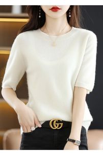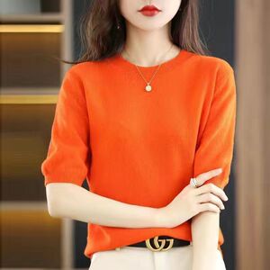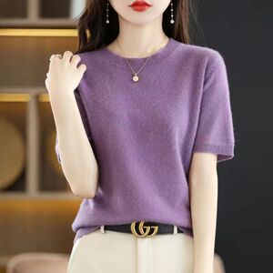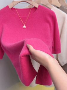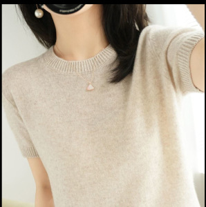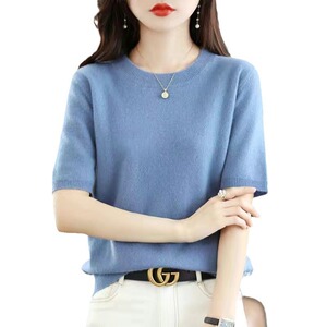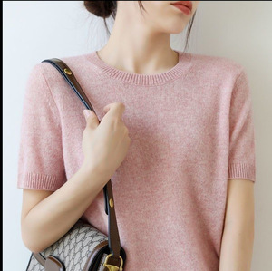 春秋圆领短袖女毛衫宽松显瘦半袖打底针织衫百搭薄款中袖毛衣洋气