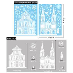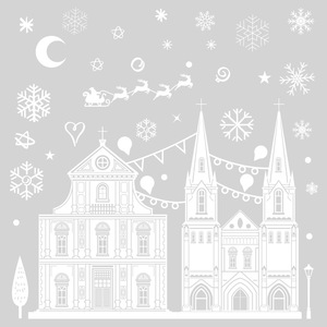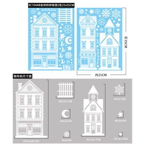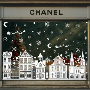 白色教堂雪景城镇房子窗贴圣诞节装饰玻璃贴纸雪花雪橇窗花静电贴