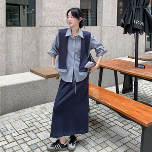 实拍韩版文艺范披肩条纹衬衫套装2025秋新款休闲气质半身裙三件套