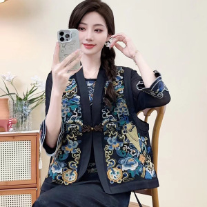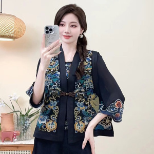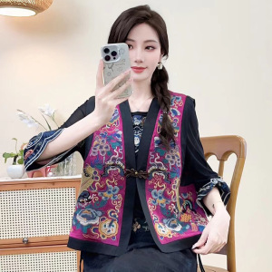 2025秋季新款V领复古一粒盘扣无袖马甲撞色民族风刺绣缎面坎肩女