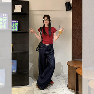 宋正恩深蓝色直筒牛仔裤女夏季新款小个子复古宽松阔腿裤弯刀裤子