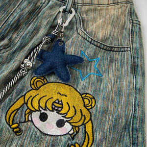 美式复古水洗星星挂饰卡通刺绣男女情侣宽松休闲潮流直筒牛仔裤