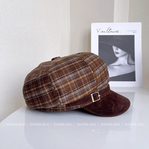 日系复古格纹拼接八角帽女秋季百搭时尚气质报童帽度假出游鸭舌帽