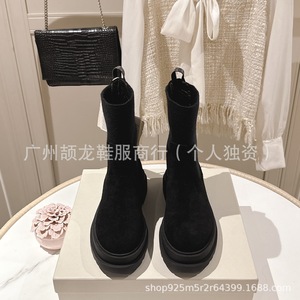 高版2025新款麂皮圆头复古粗跟厚底显瘦针织弹力套筒短靴马丁靴女