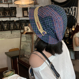 韩系复古格纹拼色渔夫帽女小众百搭文艺盆帽大头围显脸小水桶帽子