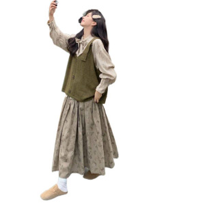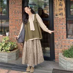 系带长袖衬衫叠穿针织马甲背心毛衣两件套女秋冬印花半身长裙套装
