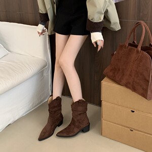 堆堆靴复古绒面短筒靴西部靴百搭女靴子2025新款粗跟骑士靴