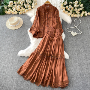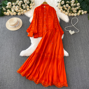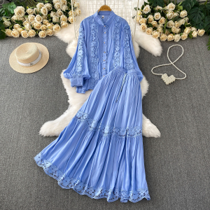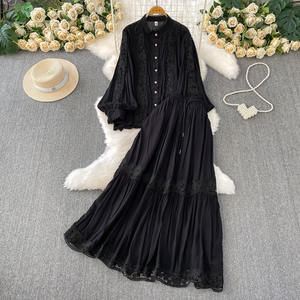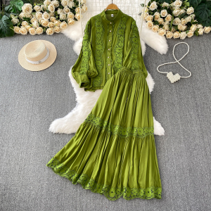 时尚温柔风粉色蕾丝拼接立领灯笼袖衬衫+高腰显瘦压褶半身裙套装