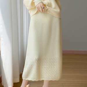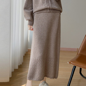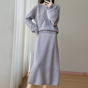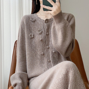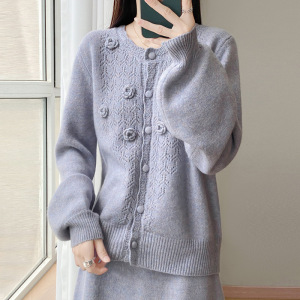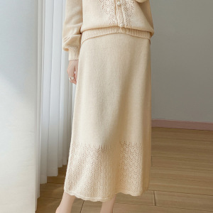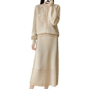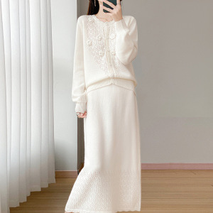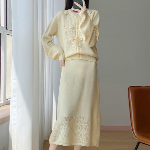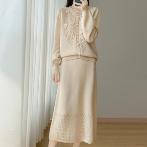 新款秋冬100羊毛女圆领开衫半裙两件套时髦减龄镂空钩花裙套装