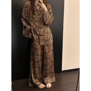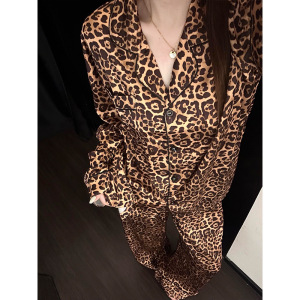 纯欲网红高级豹纹冰丝睡衣长袖女秋季薄款休闲长裤家居服大码套装