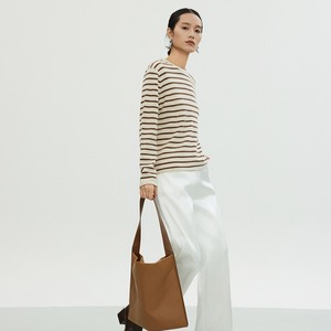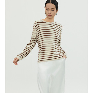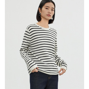 100%绵羊毛条纹撞色圆领长袖上衣宽松显瘦打底衫薄款百搭针织衫秋