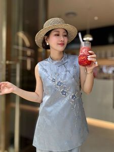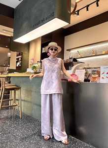 2025中式真丝丝毛套装蓝白钉珠长马甲搭配宽松舒适长裤时尚两件套