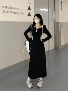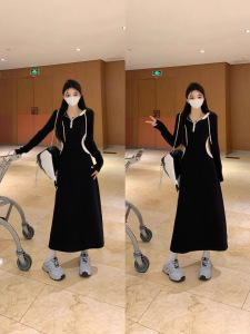 2025年大码撞色连帽长袖连衣裙女秋季黑色裙子设计感过膝别致长裙