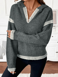 亚马逊2025欧美跨境外贸休闲宽松V领连帽毛衣深灰色撞色镶边毛衣