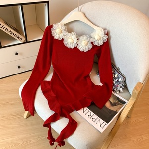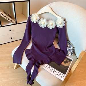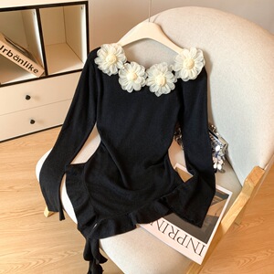 广州十三行高货爆款~玫瑰花瓣斜肩飘带收腰显瘦针织衫修身打底衣